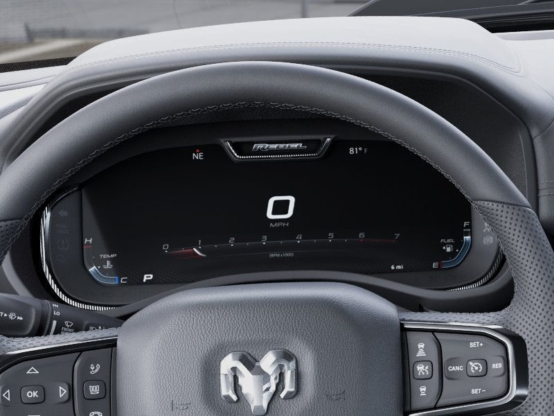 115V Auxiliary Rear Power Outlet, 12-Way/1-Way Trailer Connector, 14.4 Touchscreen Display, 2-Door Passive Entry, Front Door Locks, 4G LTE Wi-Fi Hot Spot, ABS brakes, Accent Color Door Handles, Accent Color Premium Power Mirrors, Accent Color Tailgate Handle, Active Noise Control System, Alloy wheels, AM/FM radio: SiriusXM with 360L, Apple CarPlay, Apple CarPlay/Android Auto, Auto High-beam Headlights, Auto Power-Folding Mirrors, Auto-Dimming Exterior Driver Mirror, Auto-dimming Rear-View mirror, Automatic temperature control, Black Painted Exterior Mirrors Caps, Brake assist, Bucket Seats, Connected Travel and Traffic Services, Connectivity - US/Canada, Convex Wide-Angle Exterior Mirror Insert, Delay-off headlights, Disassociated Touchscreen Display, Driver Seat Memory, Dual front impact airbags, Dual front side impact airbags, Dual Wireless Charging Pad, Electronic Stability Control, Exterior Mirrors Approach Lamps, Exterior Mirrors Courtesy Lamps, Exterior Mirrors with Heating Element, Exterior Mirrors with Memory, Exterior Mirrors with Supplemental Signals, Front anti-roll bar, Front Bucket Seats, Front dual zone A/C, Front fog lights, Front Passenger Interactive Display, Front wheel independent suspension, Fully automatic headlights, Global Telematics Box Module, Google Android Auto, GPS Antenna Input, GPS Navigation, Harman/Kardon 19 Speaker Premium Sound, HD Radio, Heads-Up Display, Heated door mirrors, Heated front seats, Heated Second Row Seats, Heated Steering Wheel, Heated steering wheel, Integrated Center Stack Radio, Integrated Voice Command with Bluetooth®, Leather steering wheel, LED CHMSL Lamp, Low tire pressure warning, Media Hub with 2 Charge Only USBs, Navigation System, Occupant sensing airbag, Off-Road Information Pages, Overhead airbag, Panic alarm, ParkView Rear Back-Up Camera, Power 2-Way Passenger Lumbar Adjust, Power Adjust 8-Way Front Passenger Seat, Power Adjustable Pedals with Memory, Power door mirrors, Power driver seat, Power Tailgate, Power windows, Proximity Approach/Departure Lamps, Quick Order Package 21W Rebel, Radio: Uconnect 5 Nav with 14.4 Display, Radio/Driver Seat/Mirrors/Pedals Memory, Rain Sensitive Windshield Wipers, Rear anti-roll bar, Rear Window Defroster, Rebel Level 2 Equipment Group, Remote keyless entry, Security Alarm, SiriusXM Radio Service, SiriusXM with 360L, Smartphone as a Key Capable, Speed control, Steering wheel mounted audio controls, Technology Group, Traction control, Trailer Brake Control, USB Host Flip, Variably intermittent wipers, Wheels: 18 x 8.0 Painted Mid-Gloss Black.